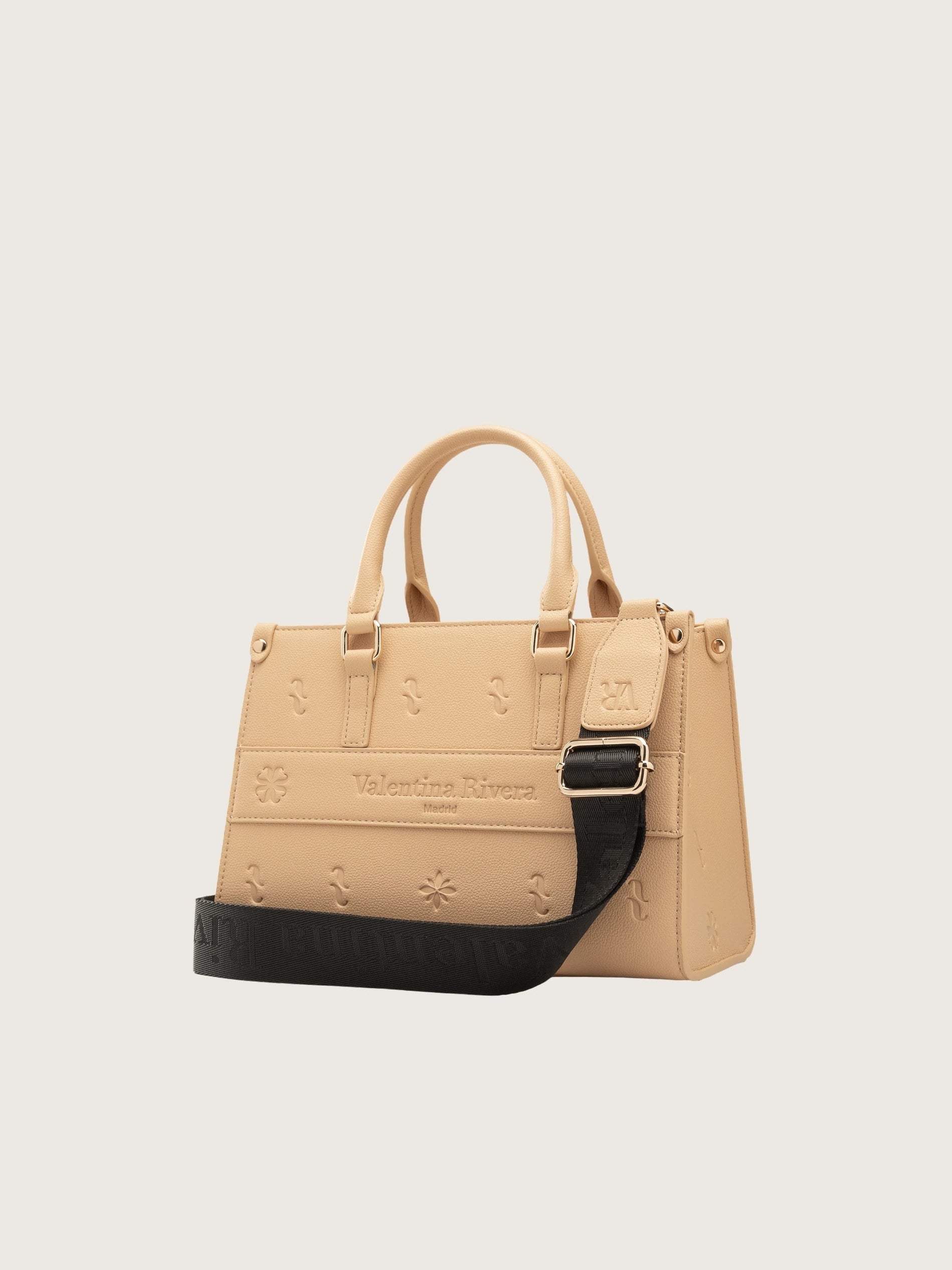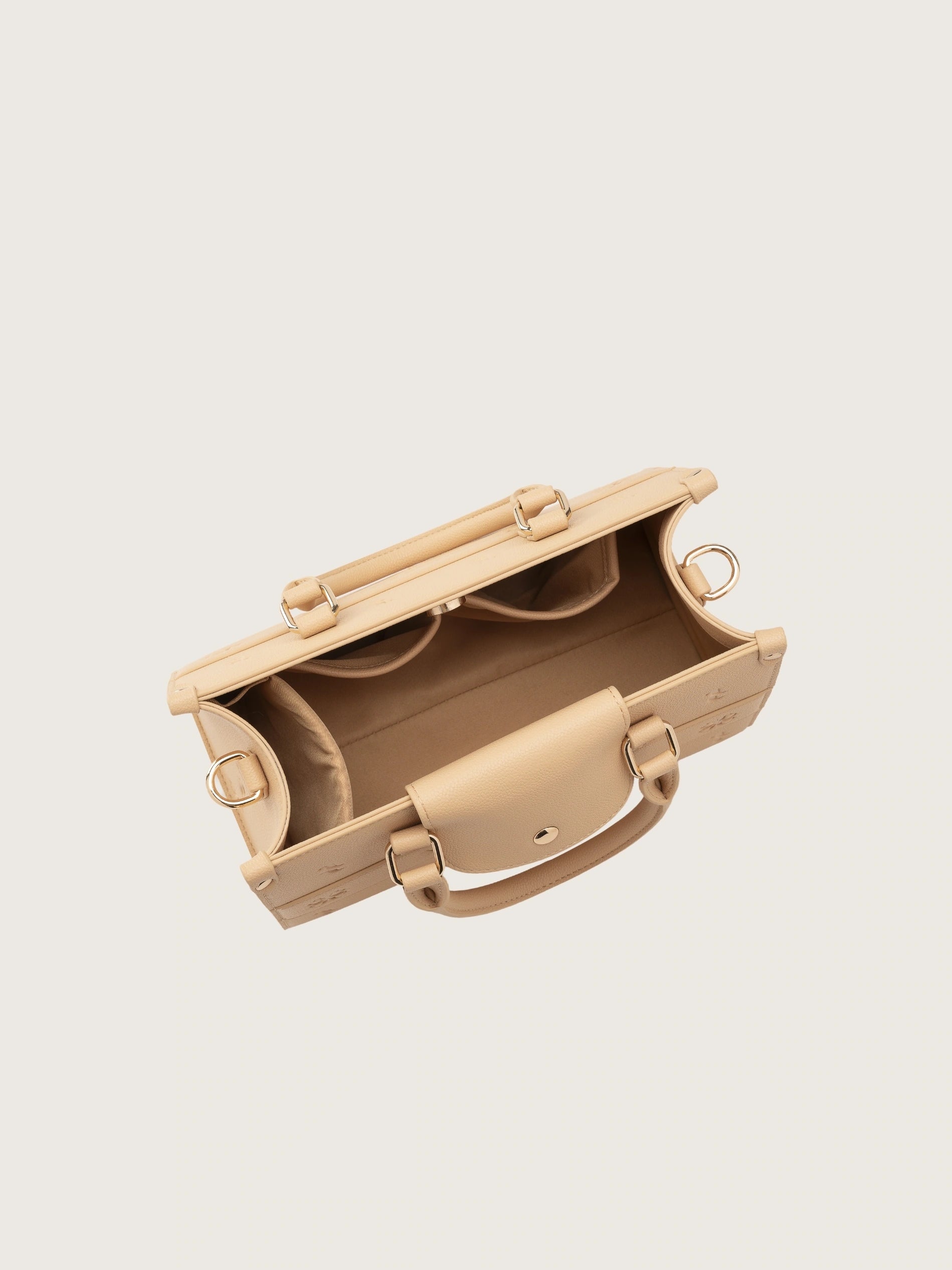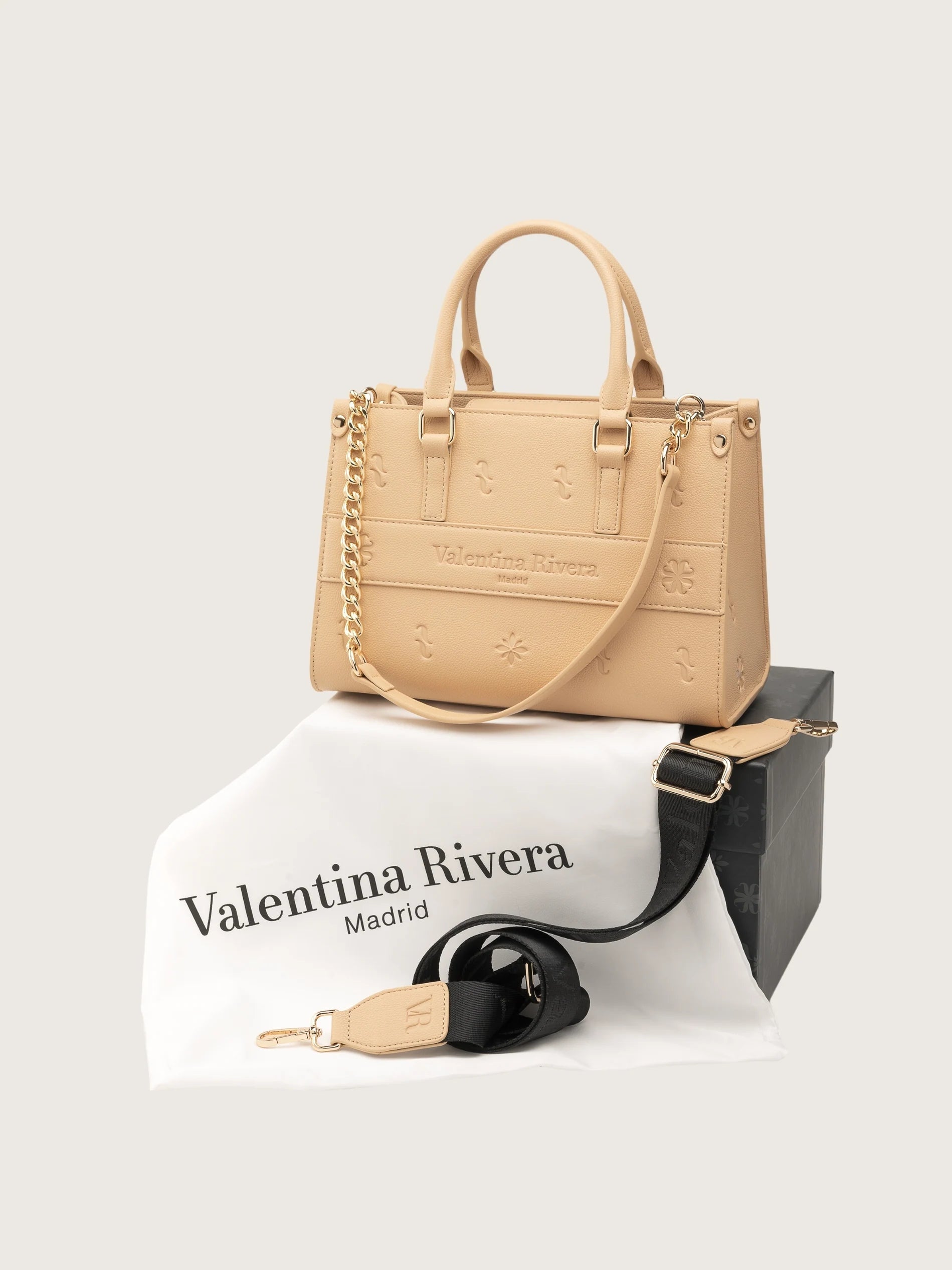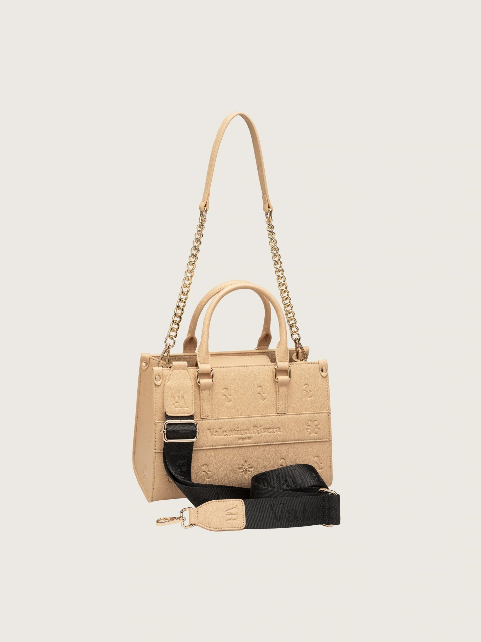 Cuenta con dos asas de mano y dos correas intercambiables: una de cadena metálica y otra de tela ajustable, que te permiten adaptarlo a tu ritmo, ya sea al hombro, cruzado o en la mano. El cierre magnético dorado aporta un toque de distinción, mientras que su interior alberga cuatro bolsillos diseñados para mantener tus objetos bien organizados.