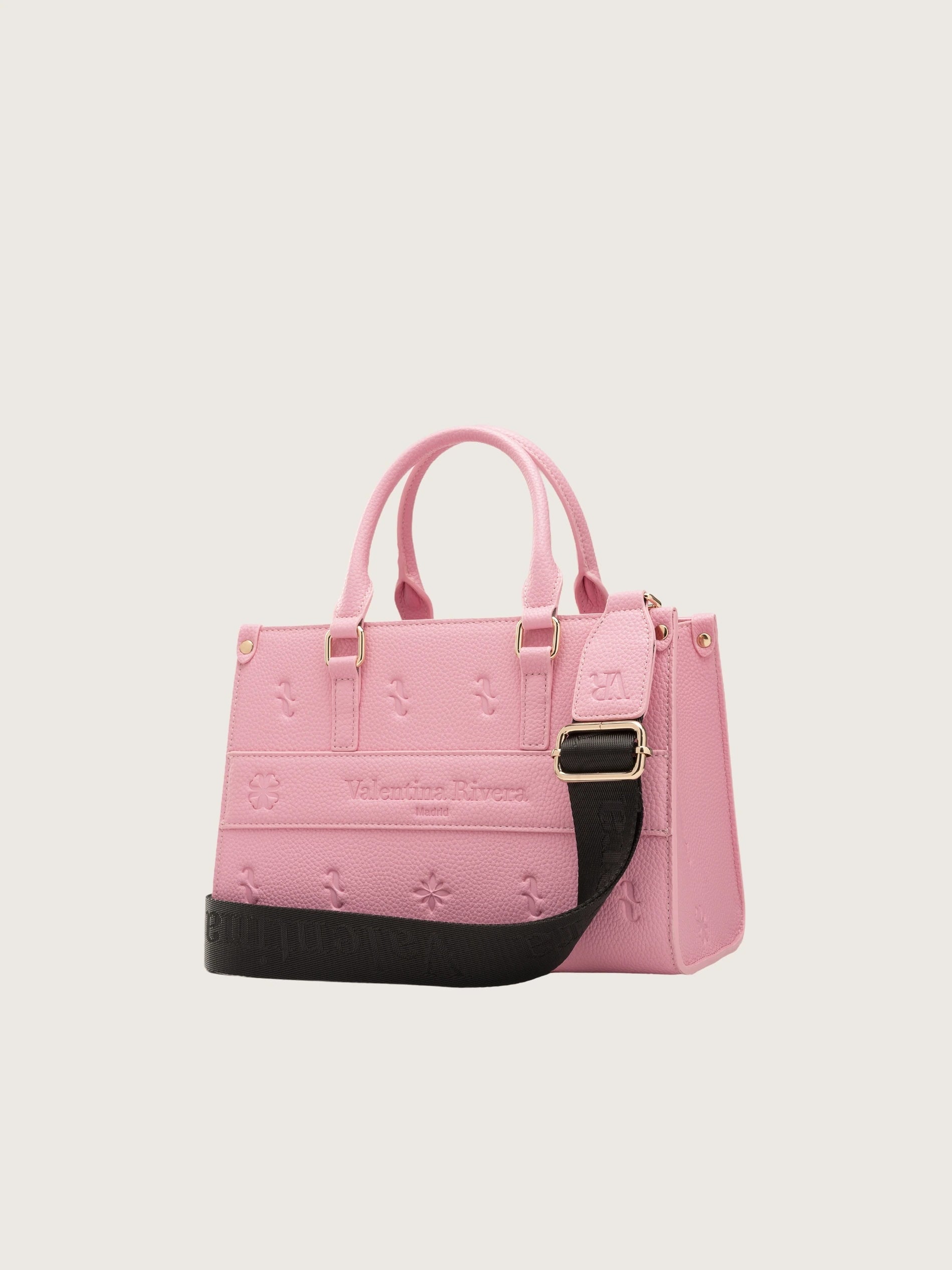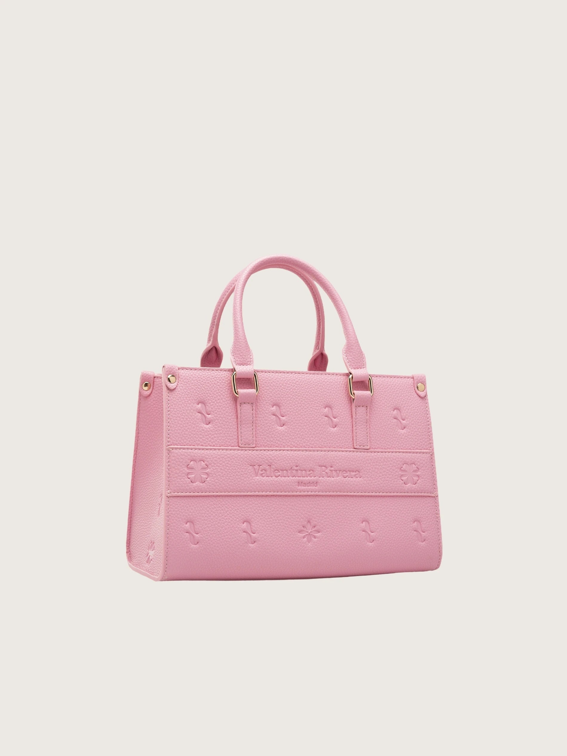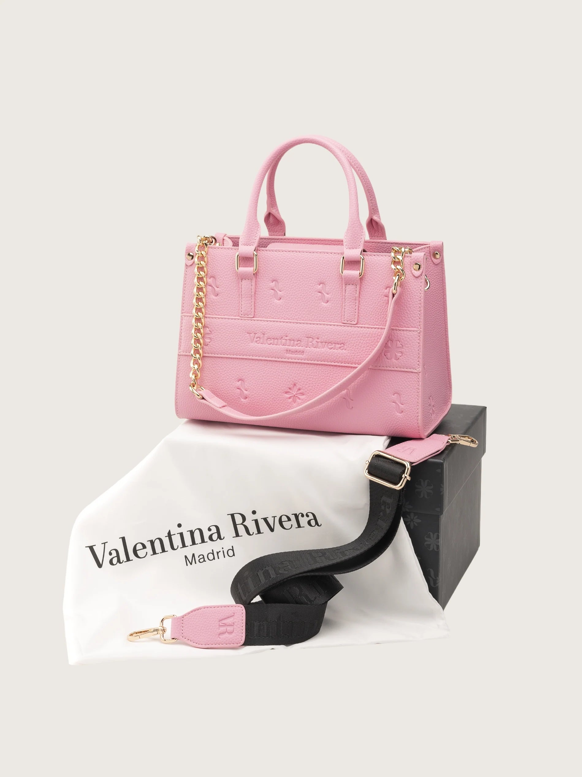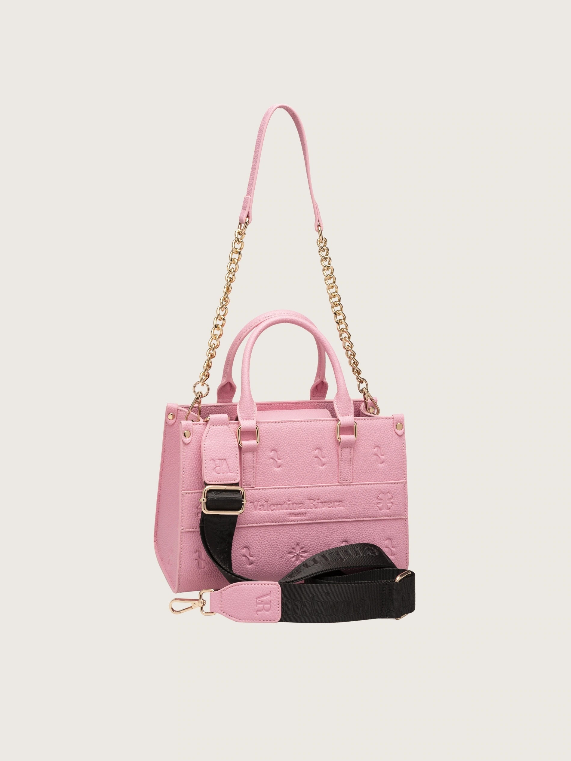 Cuenta con dos asas de mano y dos correas intercambiables: una de cadena metálica y otra de tela ajustable, que te permiten adaptarlo a tu ritmo, ya sea al hombro, cruzado o en la mano. El cierre magnético dorado aporta un toque de distinción, mientras que su interior alberga cuatro bolsillos diseñados para mantener tus objetos bien organizados.