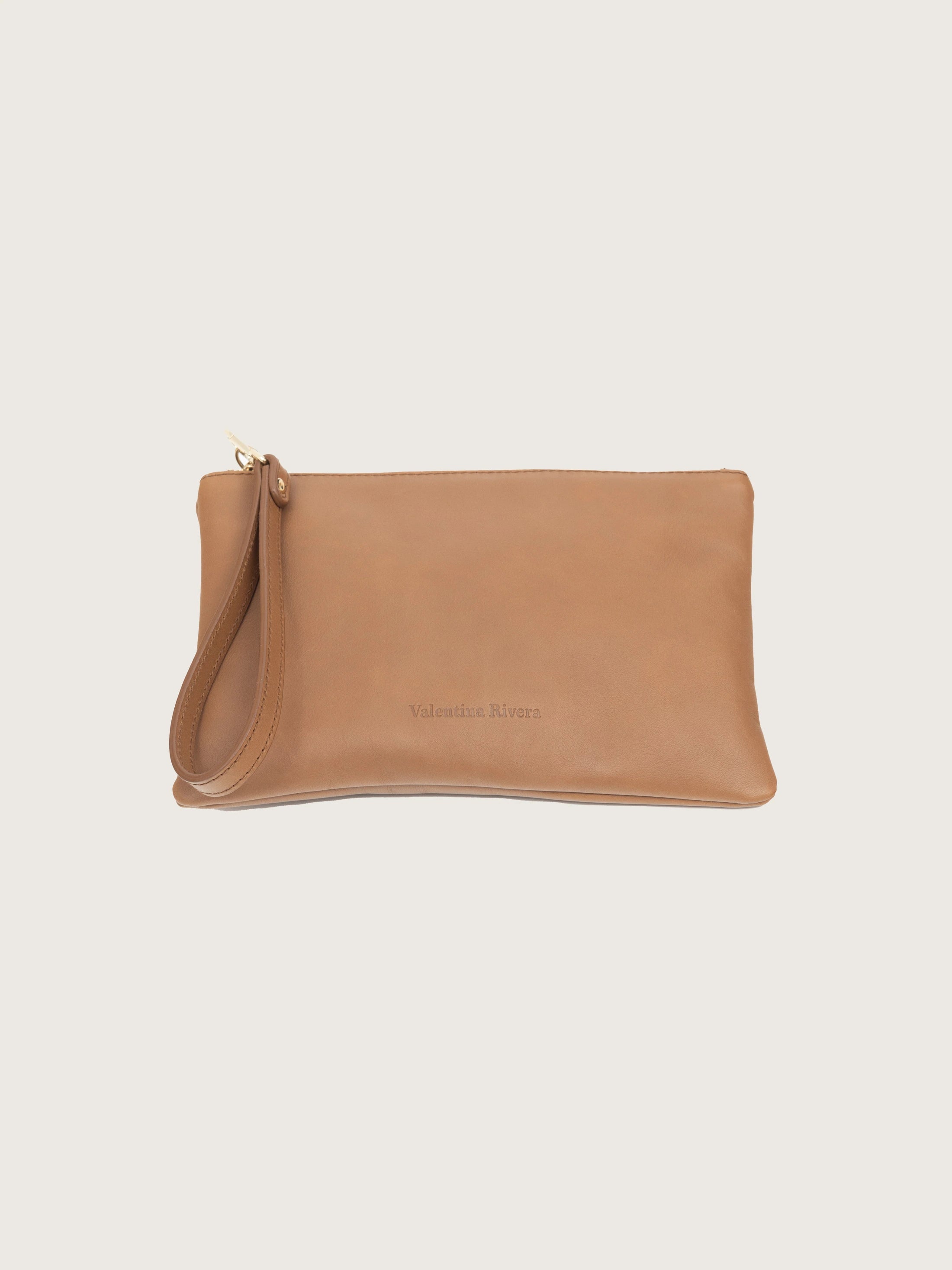 Confeccionado artesanalmente en España con piel de vacuno fruncida de textura suave y orgánica, incorpora un tirador de piel, que permite llevarla cómodamente en la muñeca. Su cierre de cremallera metálica dorada aporta seguridad y un sutil acento de sofisticación.